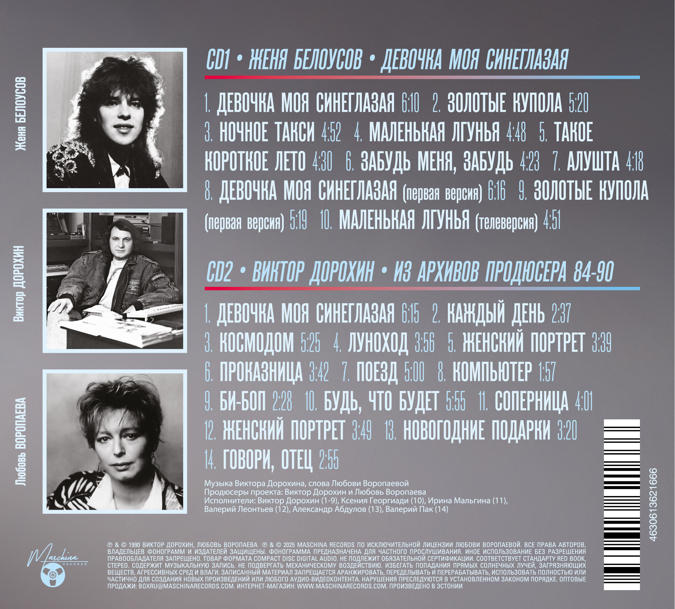 Maschina Records представляет первое издание ранних записей Жени Белоусова на компакт-диске. Ранее под таким же названием на «Мелодии» выходил авторский сборник Дорохина и Воропаевой, в который попали всего три песни артиста. «Машиновская» версия альбома включает девять композиций. Помимо упомянутых хитов, в него вошли два дополнительных трека — ранняя версия «Девочки моей синеглазой» и инструментальная зарисовка Виктора Дорохина «Каждый день». Запись издаётся с оригинальной мастер-ленты из архива Любови Воропаевой.